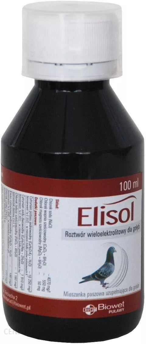 Stosowanie: Elisol należy podawać w wodzie do picia w ilości 10 ml na 1 litr wody, co stanowi dawkę dla 20 gołębi.