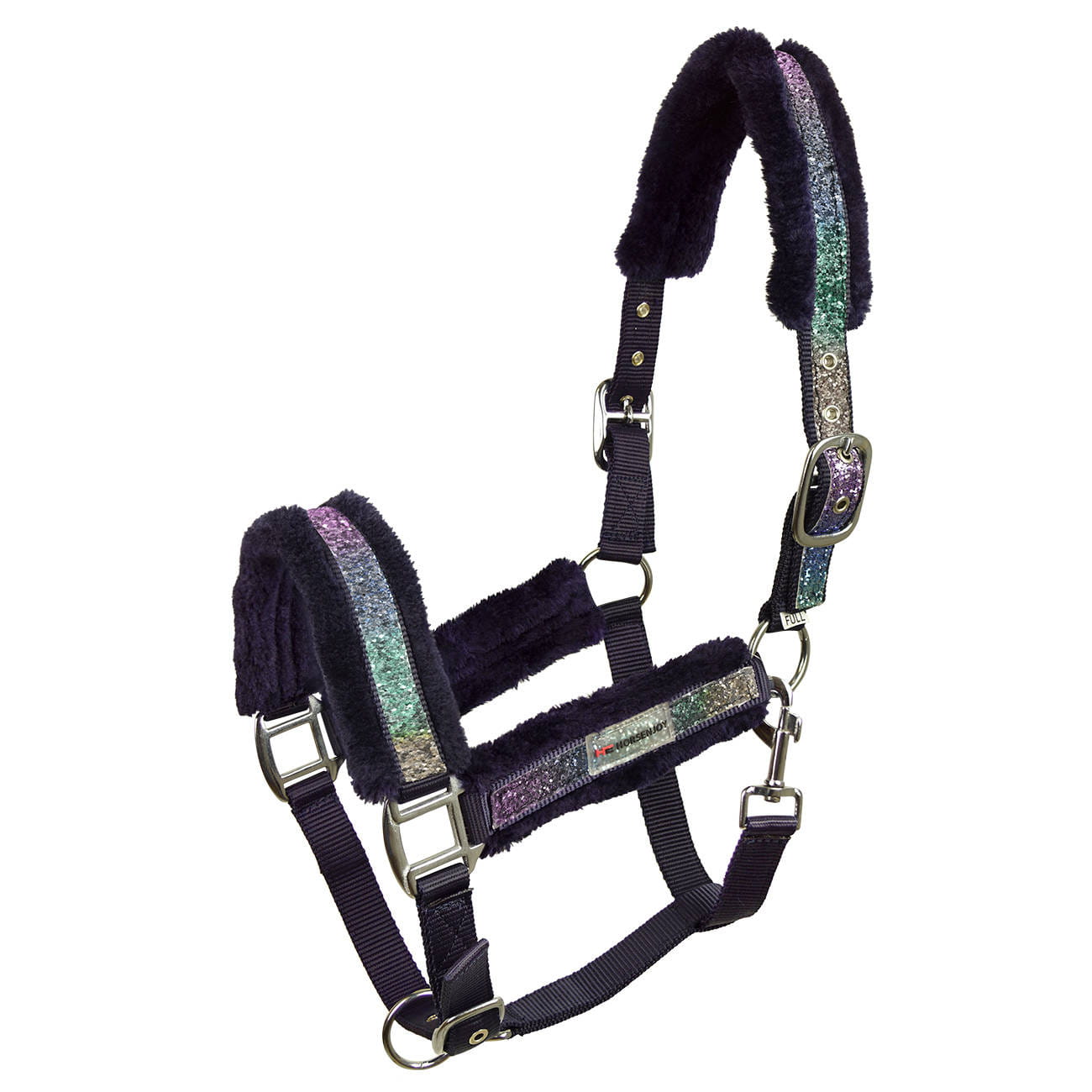 zjawiskowy kantar z dodatkiem brokatu tęczowy kolor podszyty miękkim, sztucznym futerkiem obustronna regulacja na pasku potylicznym i jednostronna nachrapnika okucia w srebrnym kolorze