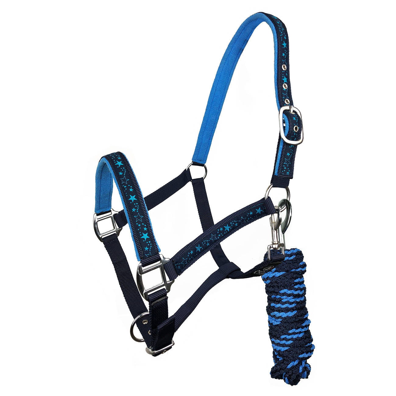 Kantar posiada miękkie podszycie, które zapewni koniowi komfort i wygodę. komfortowy kantar w komplecie z uwiązem podszyty w części nosowej i potylicznej wzór w gwiazdki regulacja nachrapnika i paska potylicznego dostępne 4 rozmiary Opis techniczny: długość uwiązu: 2,4 m