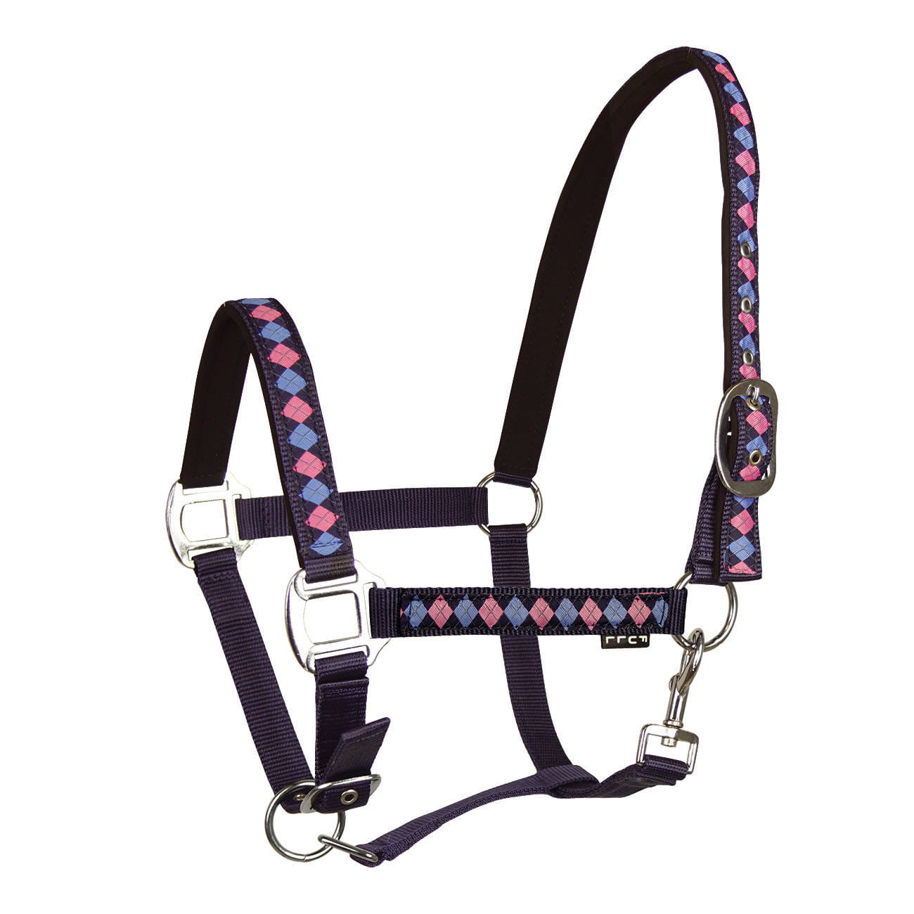 Dzięki licznym wariantom kolorystycznym i szerokiej rozmiarówce, każdy znajdzie odpowiedni model dla siebie. kantar ozdobiony wzorem w romby podszyty imitacją nubuku posiada regulację na pasku potylicznym i nachrapniku okucia w srebrnym kolorze