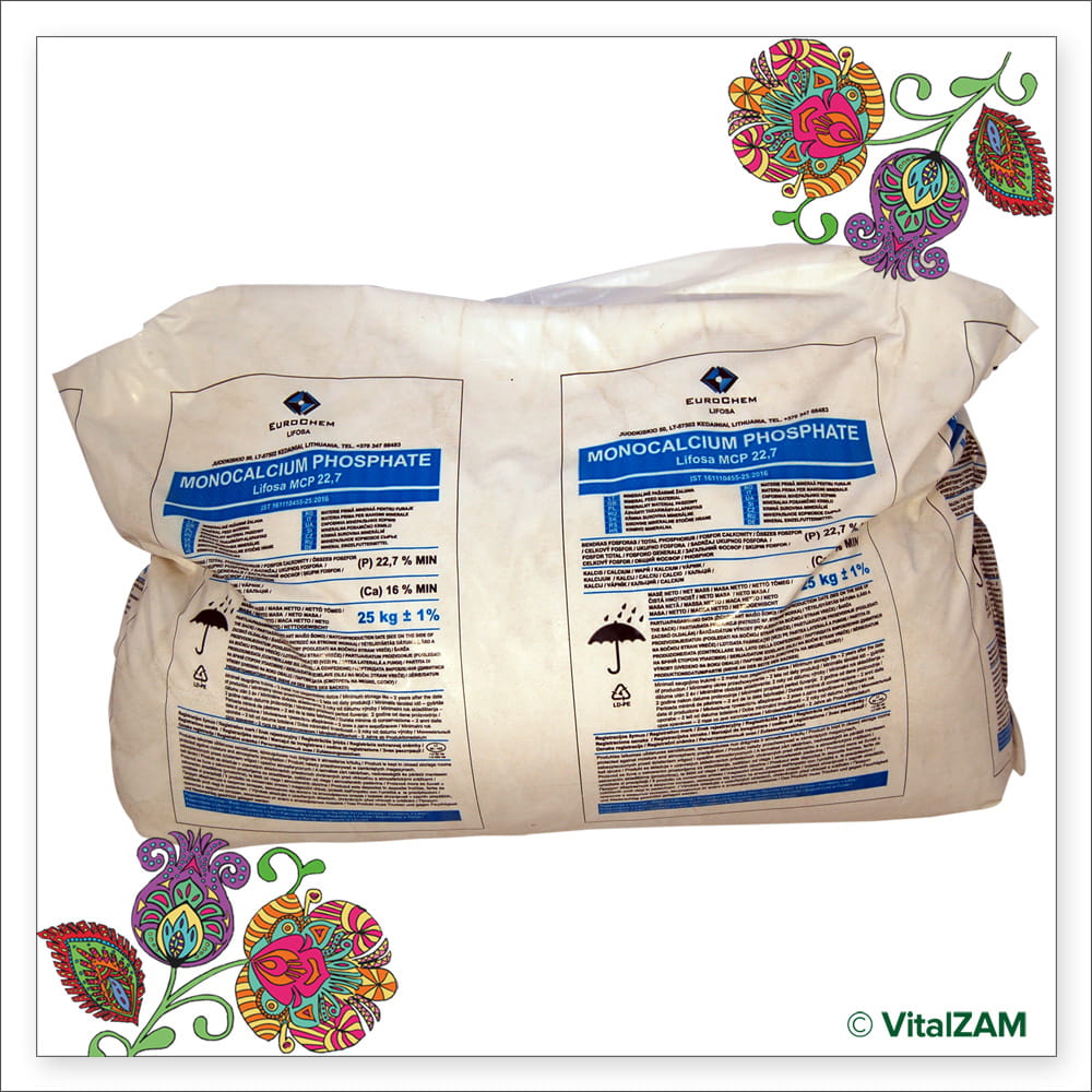 Stanowi uzupełnienie paszy o niezbędne składniki dla prawidłowego rozwoju: fosfor i wapń.