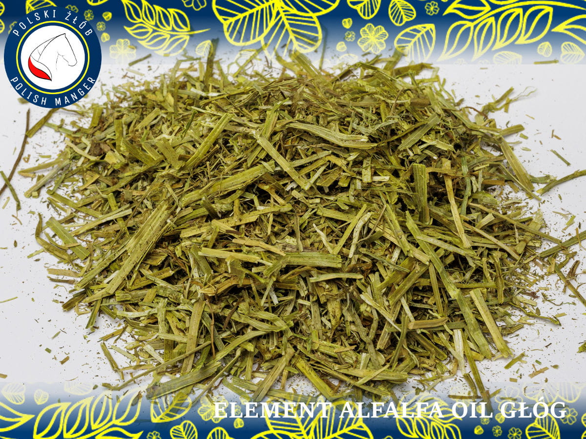 Opis produktu: Olejowana sieczka z lucerny z dodatkiem owoców głogu, skrzypu polnego oraz brunatnych alg morskich;