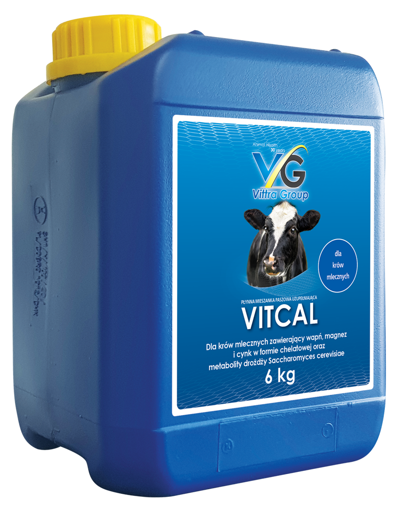 Zastosowanie Płynny dodatek energetyczno-witaminowo-mineralny dla krów mlecznych zawierający wapń, magnez i cynk w formie chelatowej oraz metabolity drożdży Saccharomyces cerevisiae. Vitcal jest preparatem nowej generacji zawierającym w swoim składzie komponenty poprawiające w znacznym stopniu status energetyczny, mineralny i hormonalny.